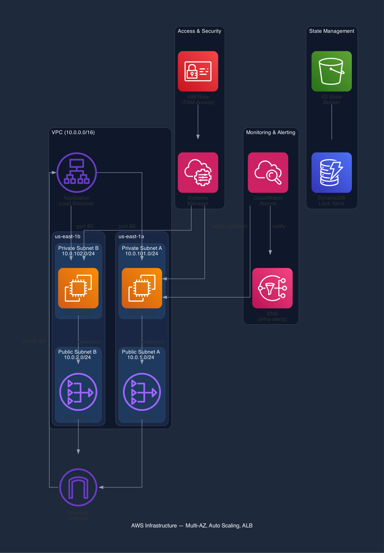 Provisioned highly available AWS infrastructure with Terraform using reusable modules. Multi-AZ VPC with public/private subnets, Auto Scaling Group (2-4 instances) behind an ALB, NAT Gateways per AZ, and IAM roles for SSM access. CloudWatch alarms on CPU utilization drive auto scaling policies and notify an SNS topic for operational alerting. CI/CD via GitHub Actions with OIDC authentication, no static credentials.